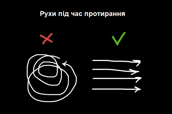При протирінні автівки насухо, рухи мають бути прямолінійними. Сенс полягає в наступному: навіть якщо під протирочний матеріал потрапить абразивна частинка і залишить на лакофарбовому покритті дрібну подряпину, вона буде видна лише під одним кутом. При безладних кругових рухах подряпина буде видно під будь-яким кутом.