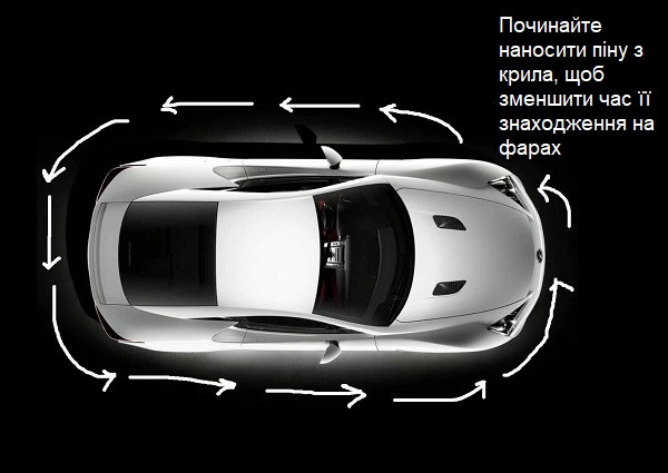 - Помити кузов активною піною. Дітейлінг-мийка починається з безконтактного миття активною піною. Для цього необхідно розвести активний шампунь, згідно з рекомендаціями виробника, та, за допомогою піноутворювача, нанести її на кузов. Наносити піну слід починаючи з переднього крила, далі по колу, закінчуючи радіаторною решіткою. Такий порядок нанесення зменшує час впливу піни на передні фари. Це важливо, тому що від контакту з активною піною прозорий пластик скла фар поступово жовтіє та покривається мікротріщинами. Щоб мінімізувати час впливу активної піни на скло фар необхідно, після нанесення, відразу змити її з фар просоченою водою губкою. Після нанесення, слід дати піні час для впливу на бруд. Зазвичай, достатньо кількох хвилин. Після цього, за допомогою апарату високого тиску, - змити піну з автівки, починаючи з передніх фар.