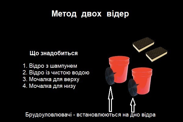 - Помити кузов шампунем та мочалкою. Наступний етап - це ручне миття, за допомогою двох відер, яке необхідне для видалення статичних забруднень. В одному відрі має бути чиста вода, а в другому - спінений шампунь. Відра повинні бути оснащені брудоуловлювачами. Мочалок теж має бути дві: одна для верхньої частини машини та друга, для більш забрудненої, нижньої.