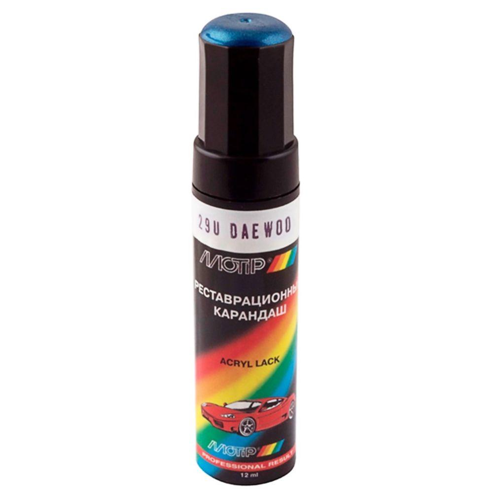 Реставраційний олівець Motip для авто Daewoo, колір 29U голубой металік. Виробник: "Motip Dupli Group". Країна-виробник: Нідерланди. Являє собою, заповнений автоемаллю, алюмінієвий флакон об'ємом 12 мл з пензликом. Призначений для точкового ремонту лакофарбового покриття автівки - підфарбовування відколів, тріщин, подряпин. Автоемаль характеризується стійкістю до погодних умов, має високу механічну міцність, відмінну адгезію та покриванність. Володіє високою атмосферостійкістю, а також стійкістю до миючих засобів, мінеральної оливи, бензину. Покриття стійке до зміни температур від -30 до 110°C. Вимагає покриття безбарвним акриловим лаком.