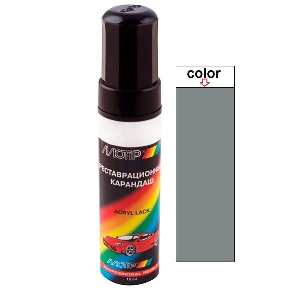 Реставраційний олівець Motip для авто Toyota, колір 1J9 сірий металік. Виробник: "Motip Dupli Group". Країна-виробник: Нідерланди. Являє собою, заповнений автоемаллю, алюмінієвий флакон об'ємом 12 мл з пензликом. Призначений для точкового ремонту лакофарбового покриття автівки - підфарбовування відколів, тріщин, подряпин. Автоемаль характеризується стійкістю до погодних умов, має високу механічну міцність, відмінну адгезію та покриванність. Володіє високою атмосферостійкістю, а також стійкістю до миючих засобів, мінеральної оливи, бензину. Покриття стійке до зміни температур від -30 до 110°C. Вимагає покриття безбарвним акриловим лаком.